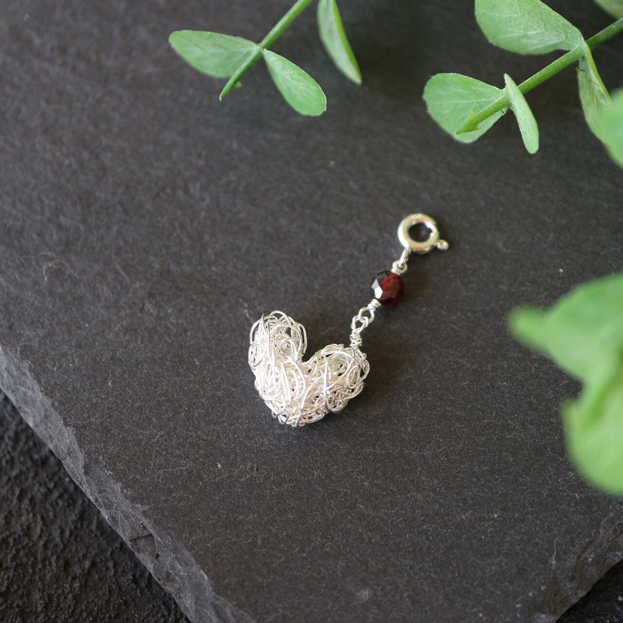 【マスクチャーム】[silver999]純銀クロッシェのハートモチーフとガーネットのマスクチャーム