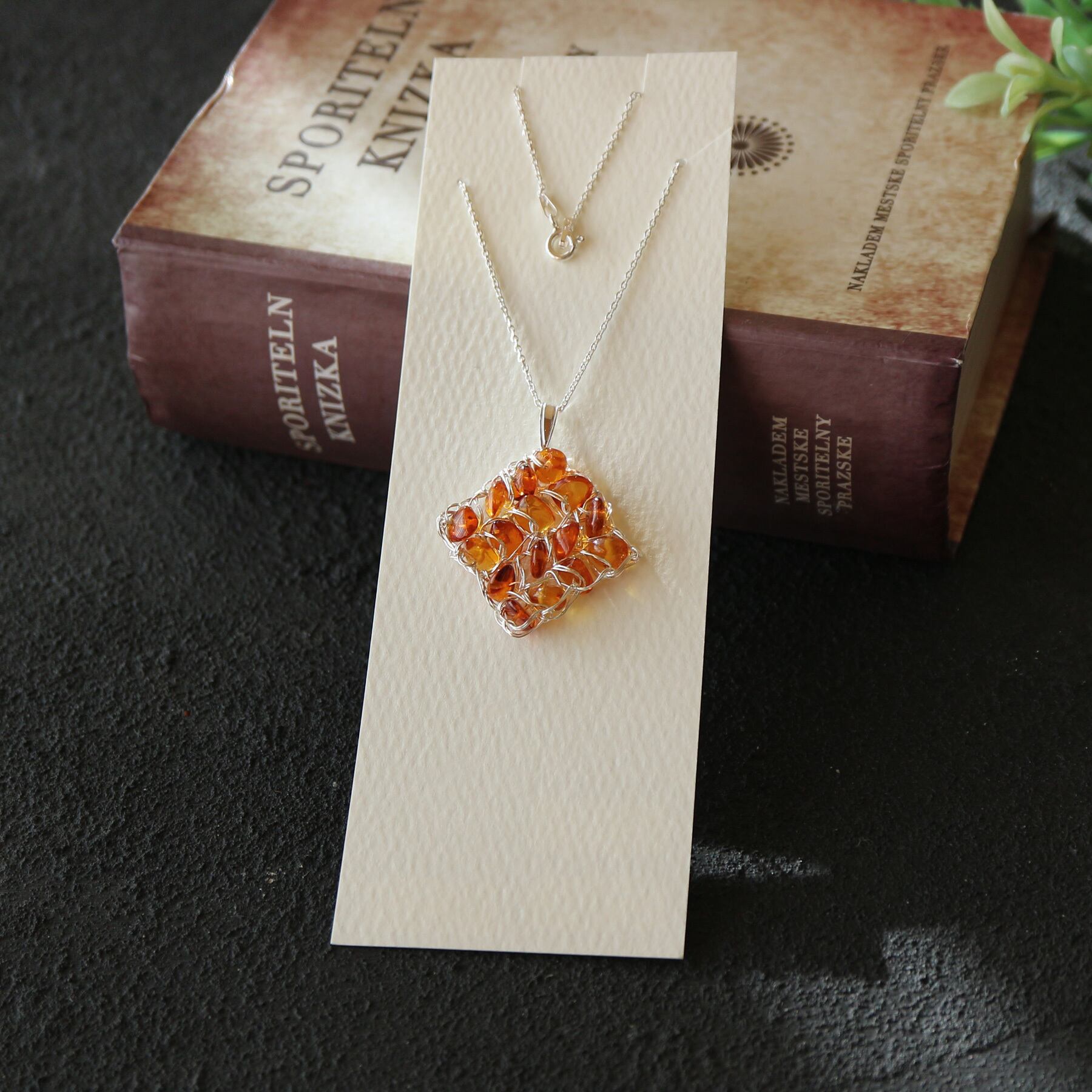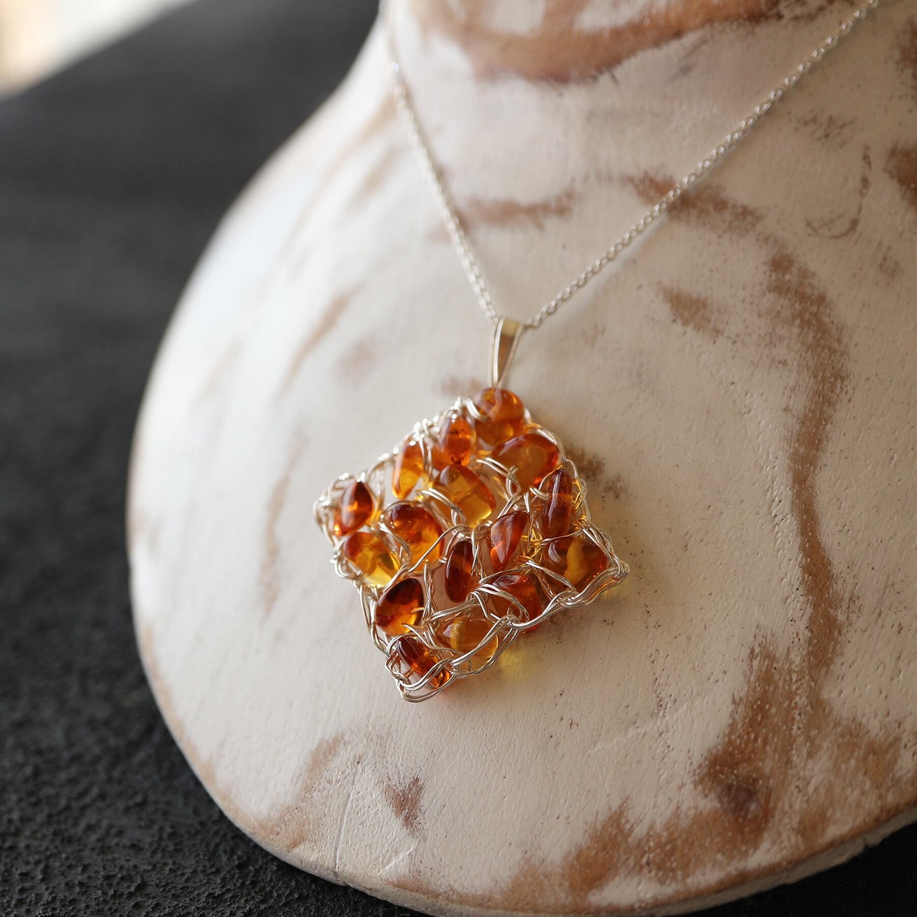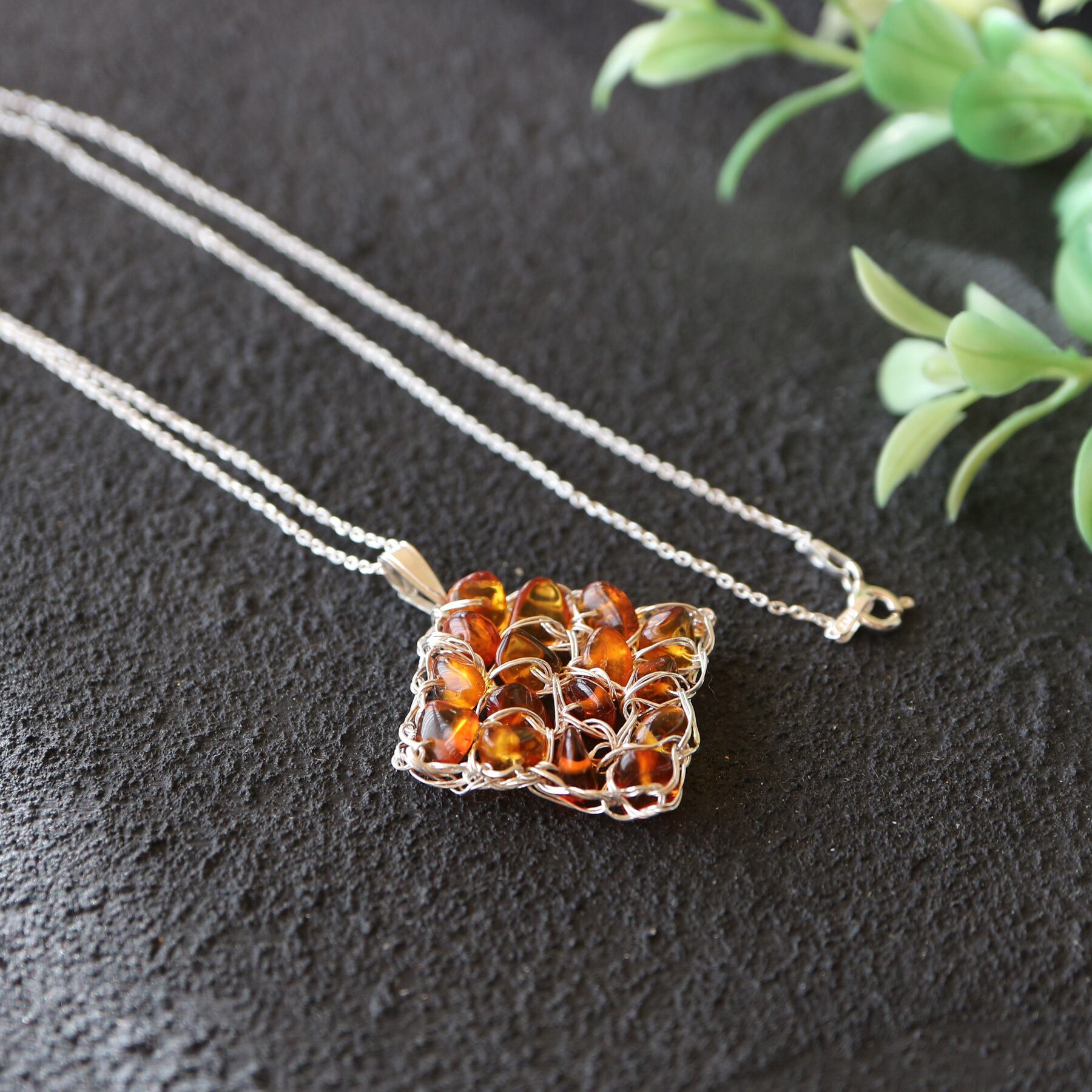 純度99.9%の純銀線で琥珀のサザレを編み込み、スクエアネックレスを作りました。