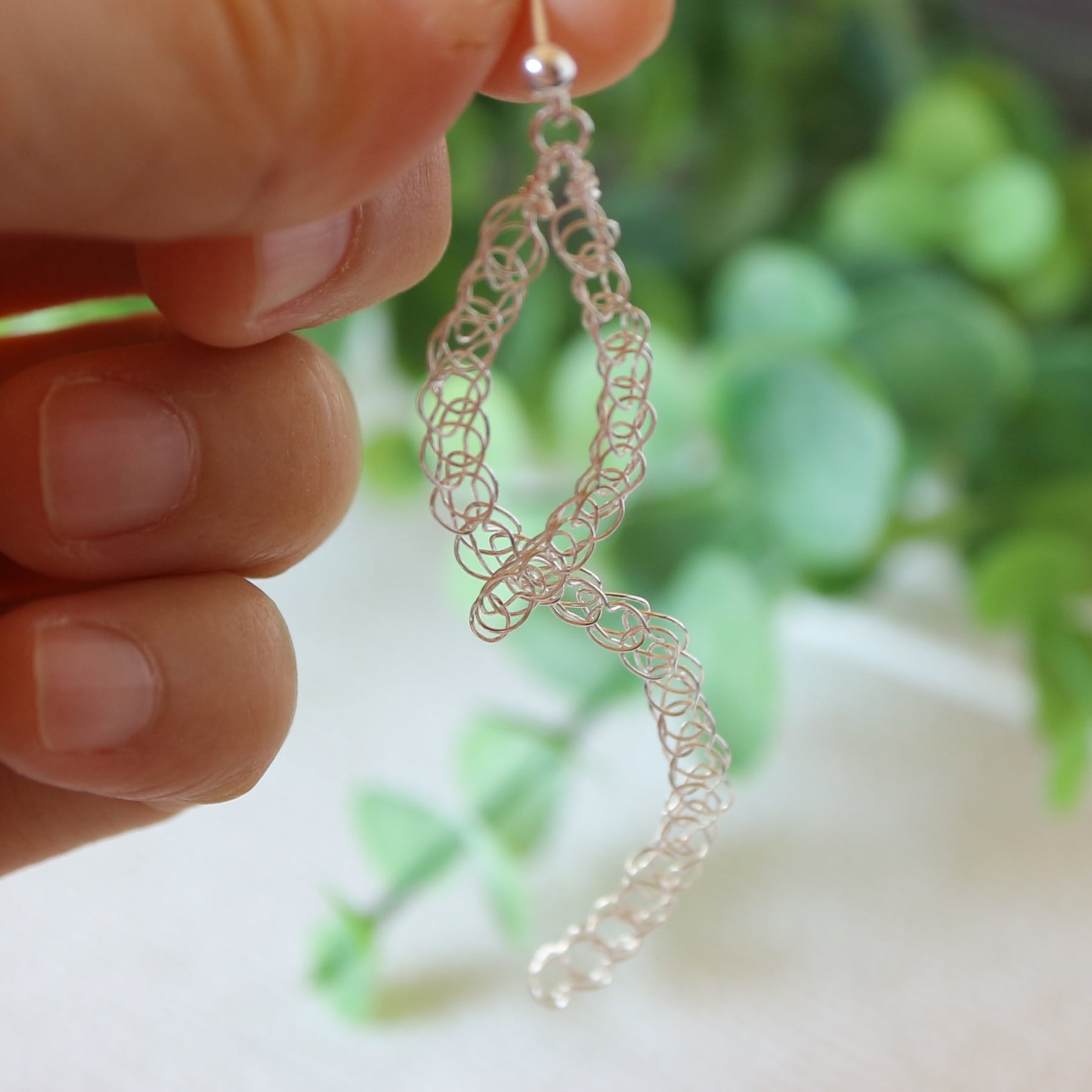 純度99.9%の純銀線をかぎ針で編み、ピアスを作りました。